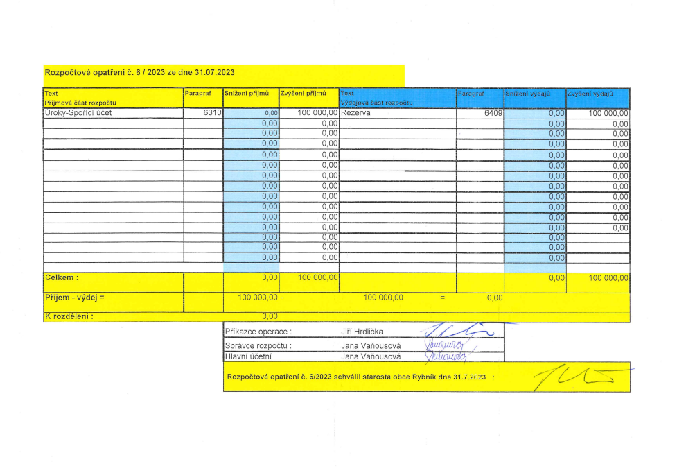 Rozpočtové opatření č. 6:2023 ze dne 31.7.2023